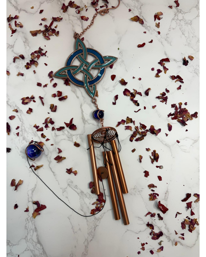 Carillón o campana de viento con el Nuedo de Bruja, en dos colores a elegir, verde y azul o gris y azul. Símbolo protección y poder.