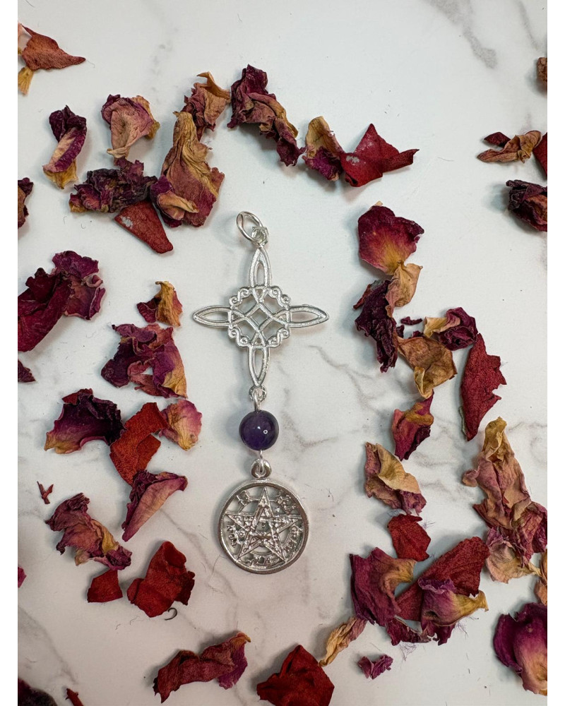 Colgante de Doble Protección, el Nudo de Bruja, bloquea y devuelve energías negativas, uniendo los elementos, mientras que el Tetragramatón, actúa como un poderoso escudo contra el mal, conectando con lo divino y equilibrando el espíritu, creando así una sinergia de de defensa integral para alejar la negatividad y atraer armonía y fuerza interior. Aportando la amatista a su vez, paz, traquilidad y conexión espiritual.