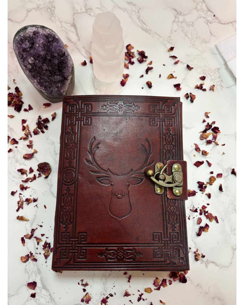 Cuaderno hecho artesanalmente de cuero, en la portada nos encotramos un ciervo, símbolo de nobleza, conexión con la naturaleza y transformación.