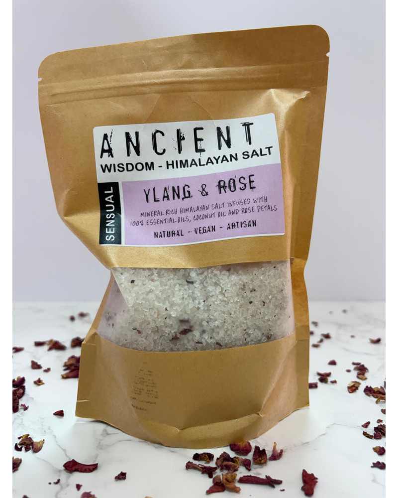 Sal mineral rica del Himalaya con aceite esencial de ylang ylang, considerado un afrodisiaco narutal y coco, aportando una hidratación profunda, con pétalos de rosa secos.